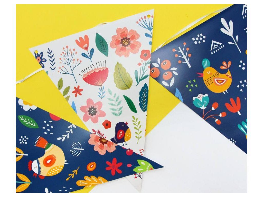 В него се редуват светли и тъмни знамена с мотиви на птици и цветя.