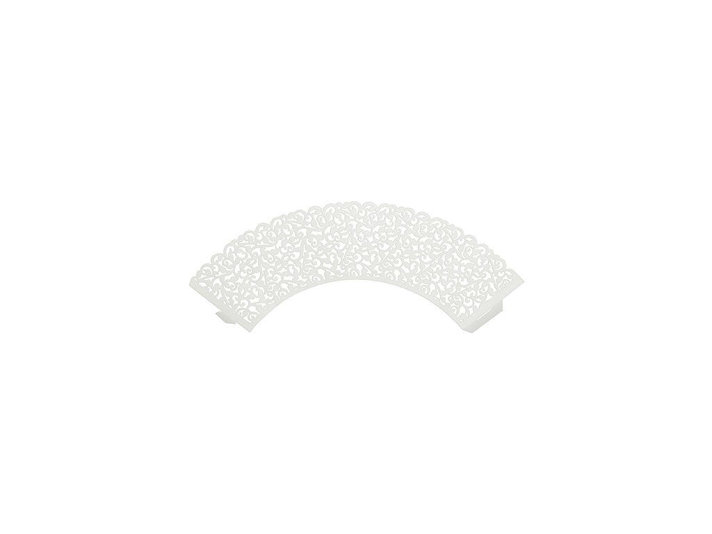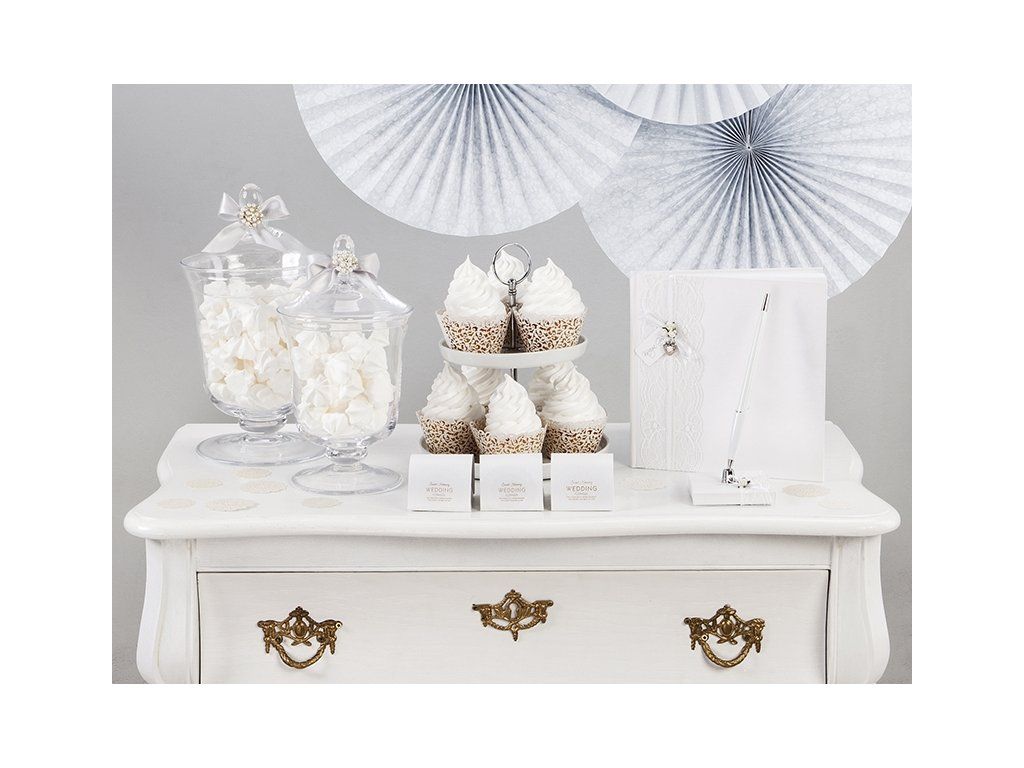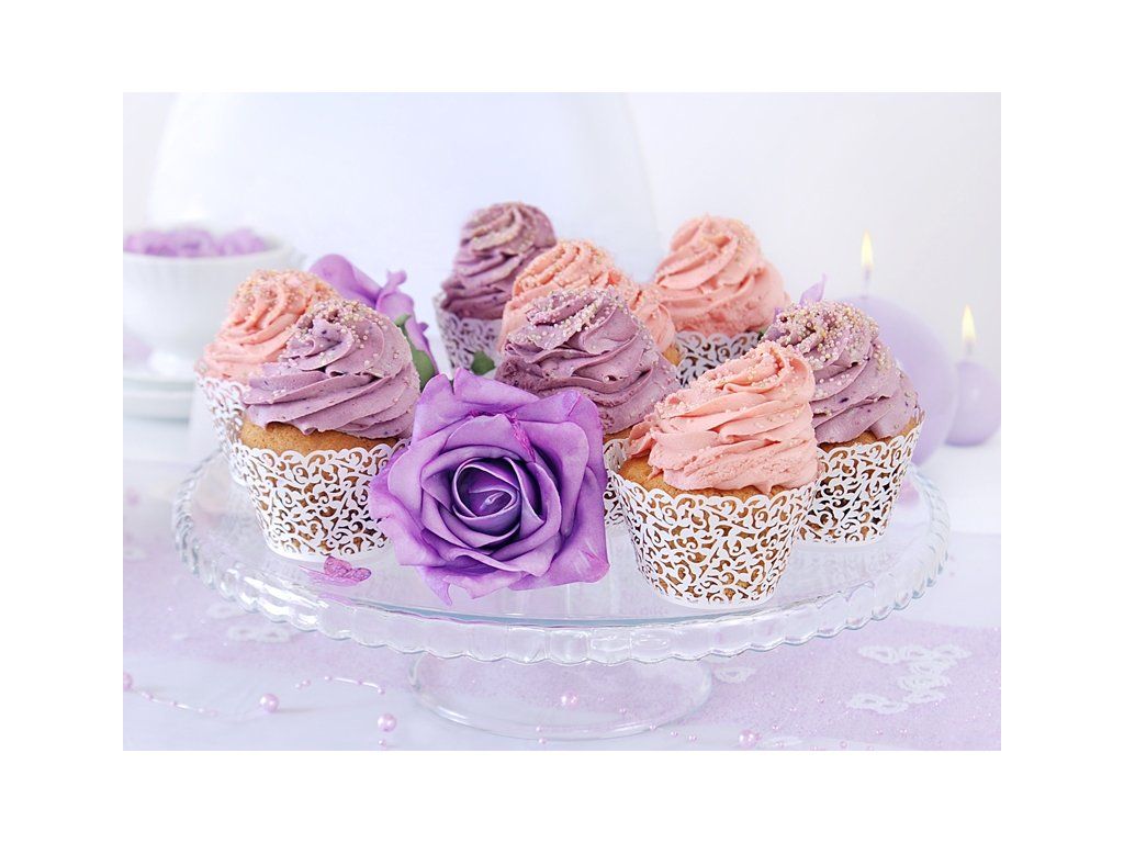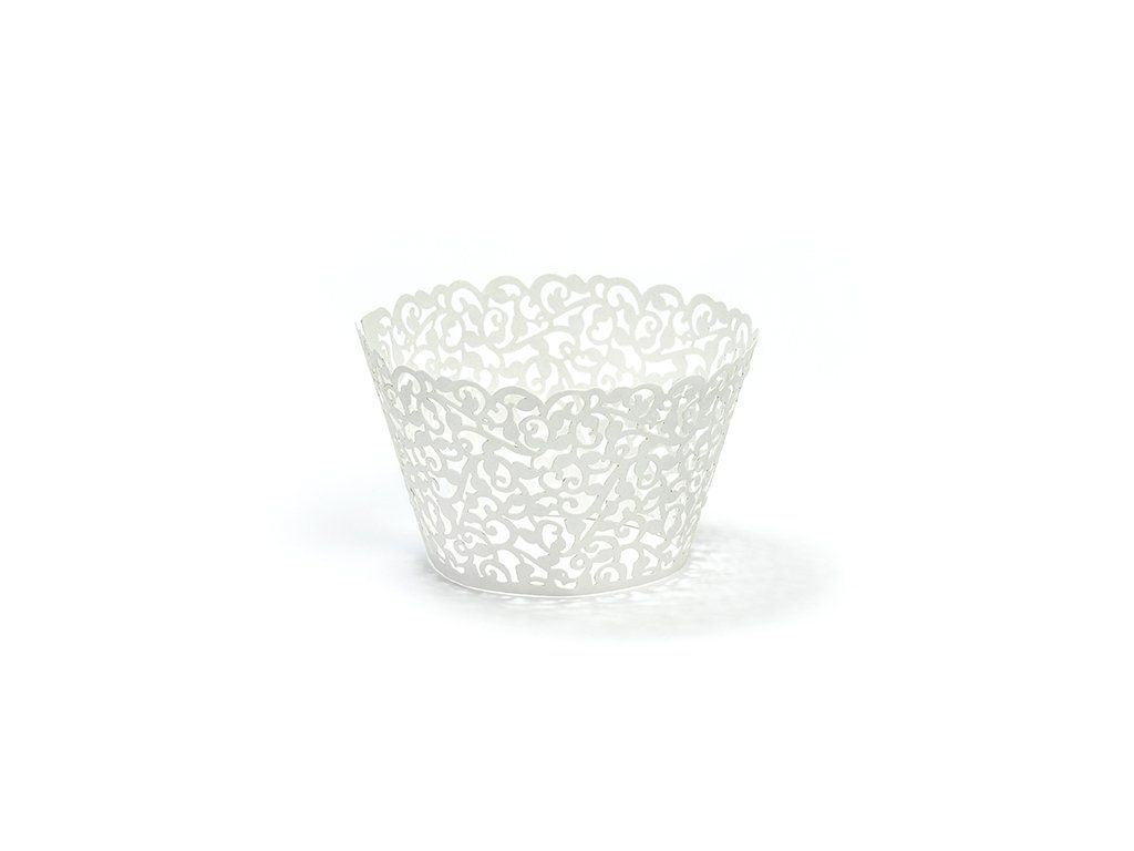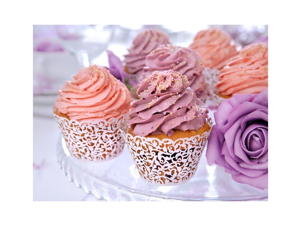Елегантни бели кошнички за мъфини или къпкейк с интересни оргаменти, подходяши са за бар с десерти, за празненства, кръщене или други значими тържества.