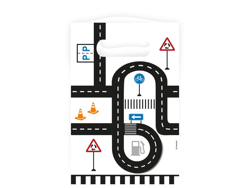 Оригинални подаръчни торбички с мотив на пътно движение. Подходяща е, ако искате да обърнете малко внимание на гостите си на тържеството, но е подходящ и за малък подарък за рождения ден. Със своя мотив чантата е подходяща за темата на Party Road party.