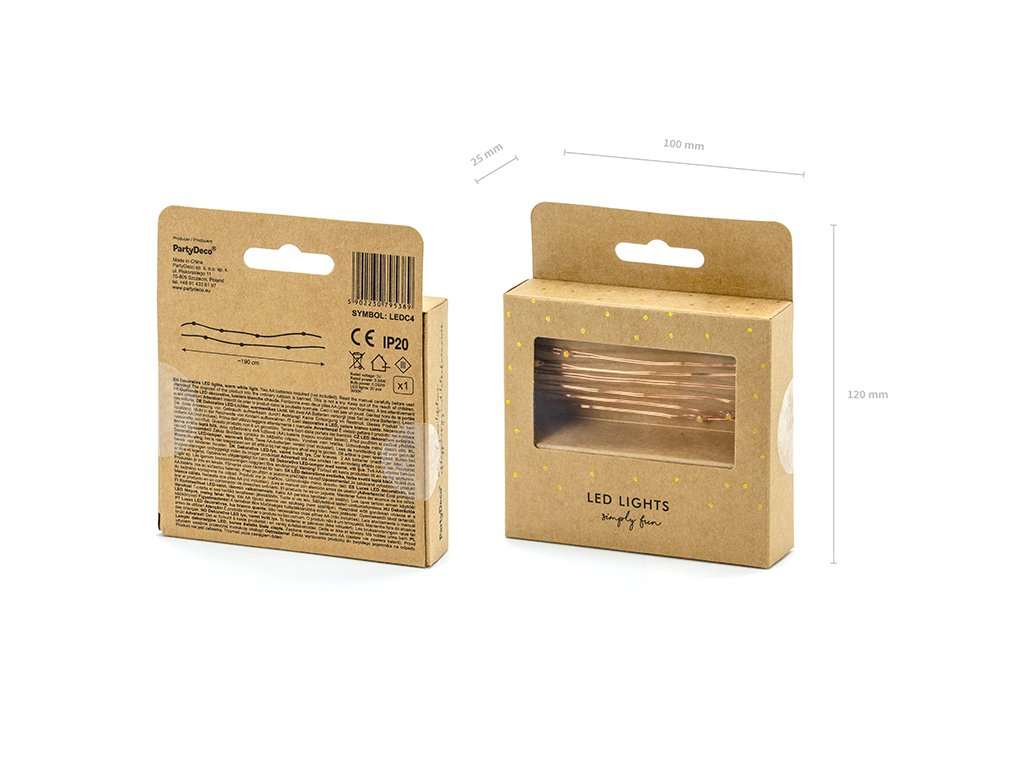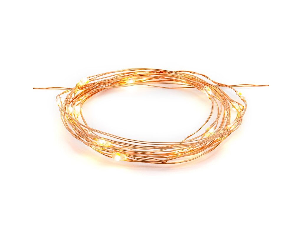 Декоративни led светлини на медна тел с 20 лампи с топъл бял светъл цвят. Номинална мощност: 0,64 W; Номинално напрежение: 3V; Мощност на лампата: 0,322 W; 3 000 К.