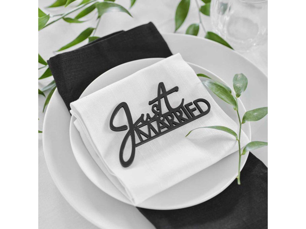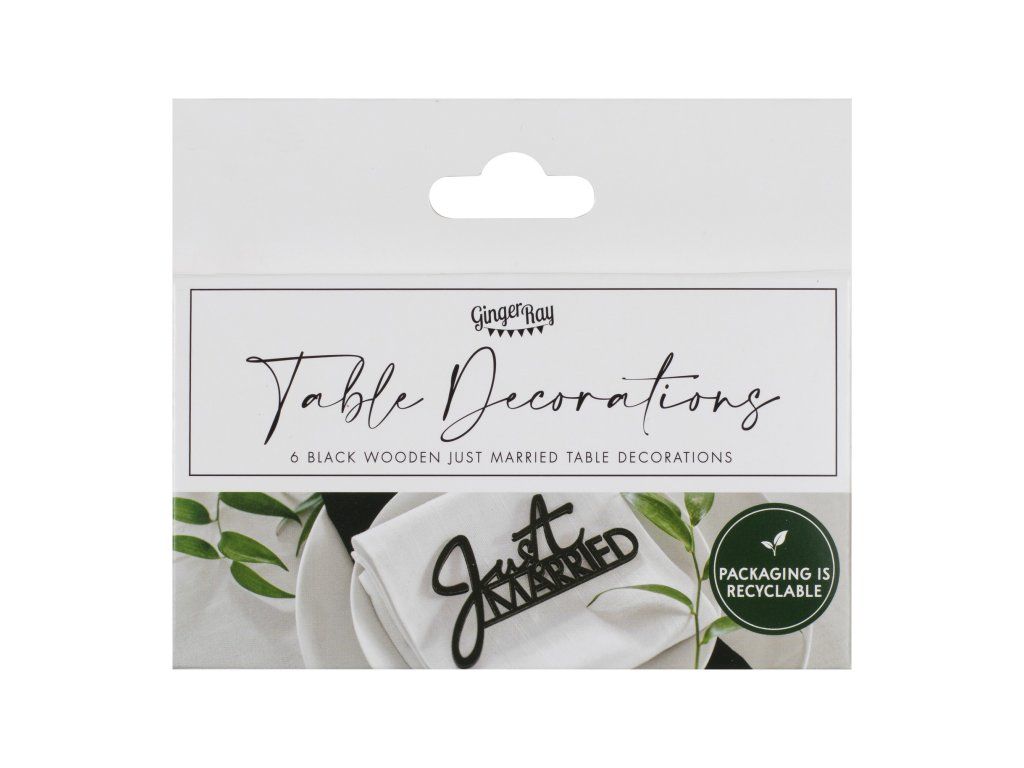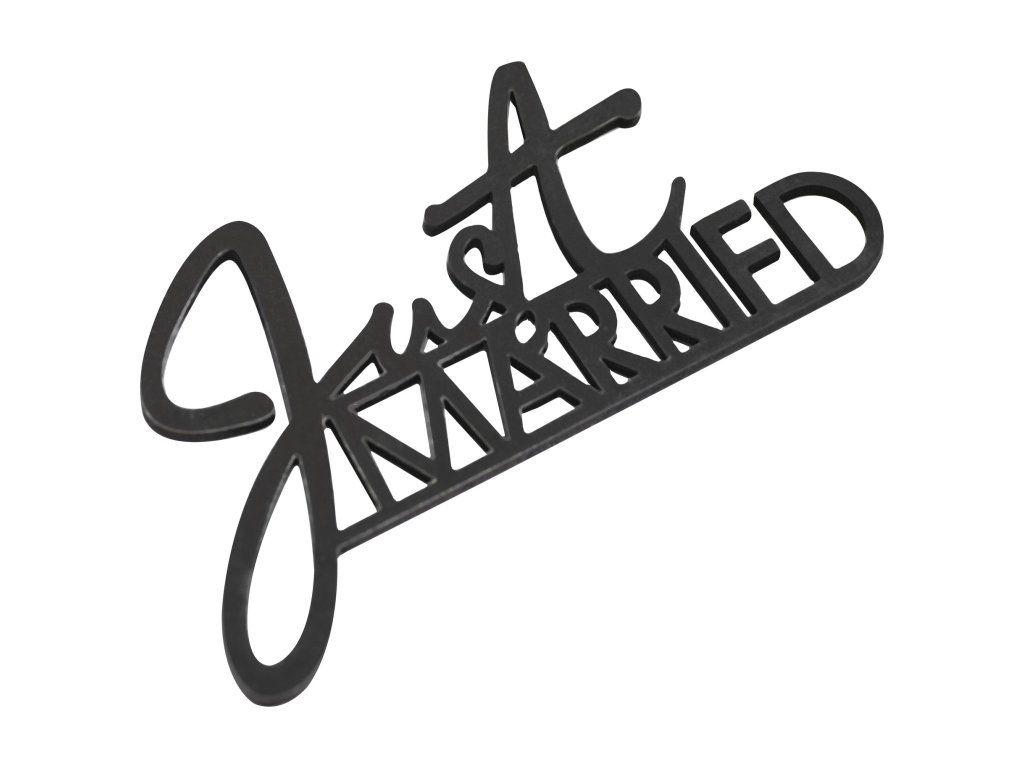 Украсете местата за сядане на гостите си. Тази черна дървена декорация Just Married, е идеалният начин да завършите сватбената маса. В съчетание с бяла покривка ще създадете красива елегантна обстановка на масата. Направете празничната маса и покривки за маса уникални.