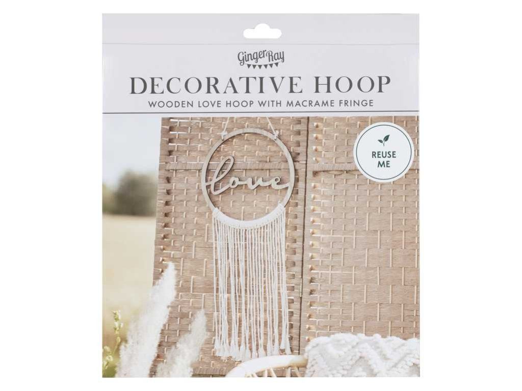 Използвайте този красив дървен обръч, украсен с макраме и думата LOVE, като перфектна декорация за вашата бохо сватба или годеж. Всяка сватбена декорация включва един дървен кръг с думата "LOVE", изписана с декоративен шрифт, украсен с висящо макраме. Тази висяща сватбена декорация ще бъде идеалният завършек на вашето тържество.