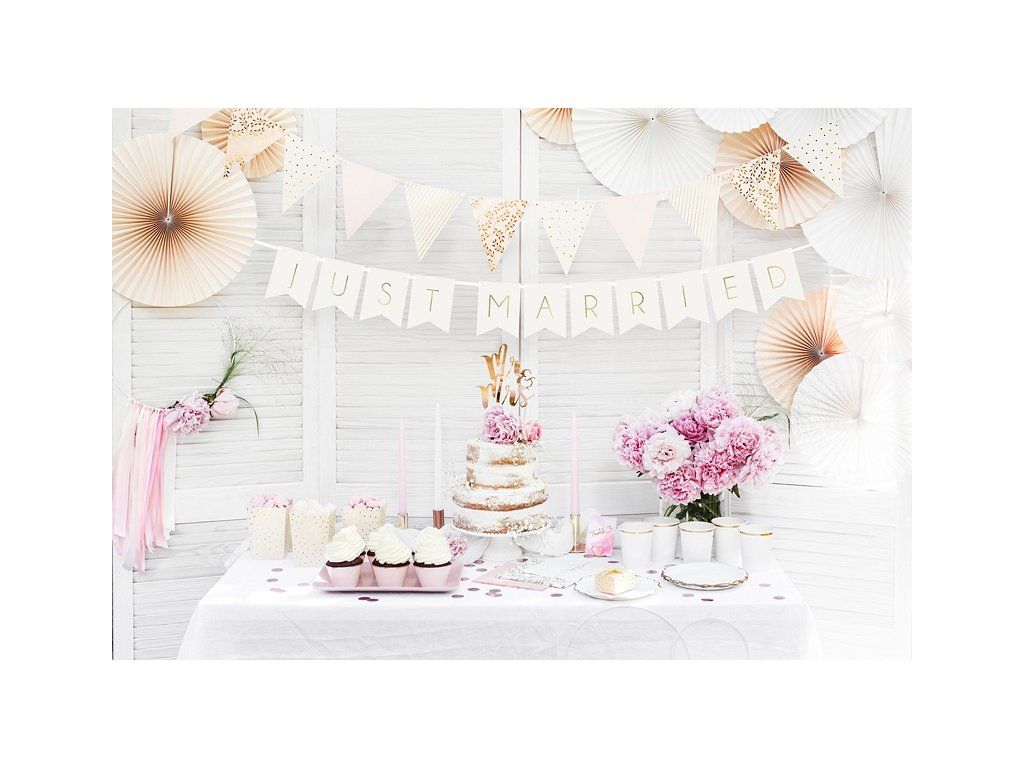 Създайте красива украса за сватбено парти с помоща на тези красиви гирлянди. Този гирлянд в елегантен бял цвя и златен надпис ще пасне идеално.