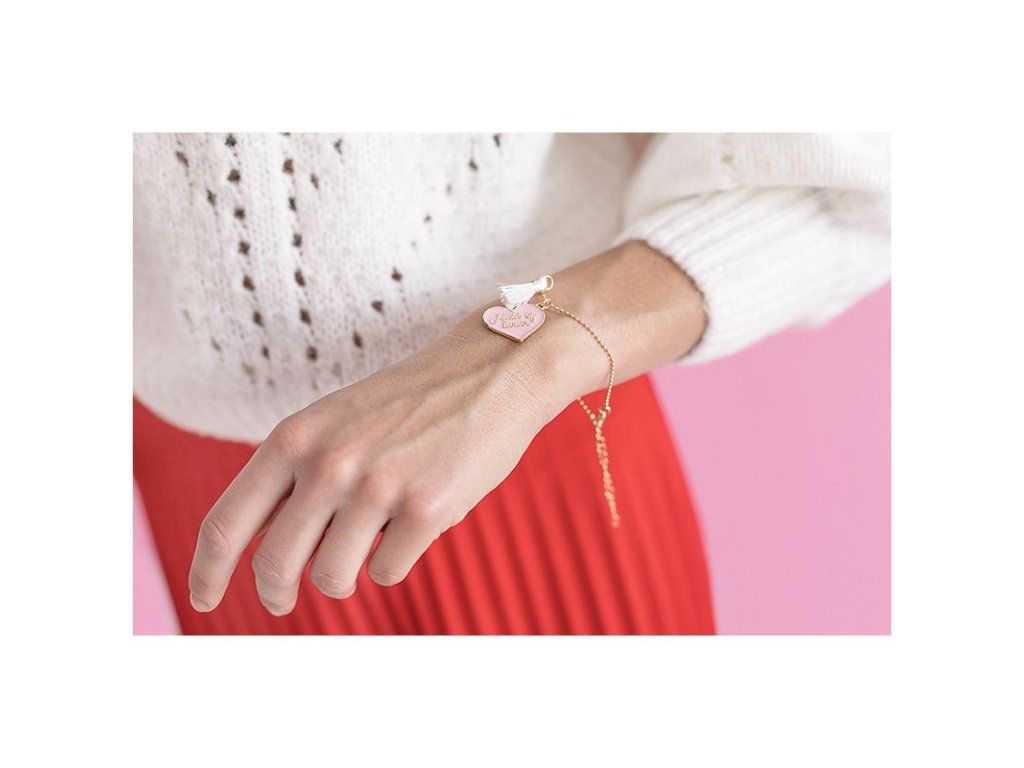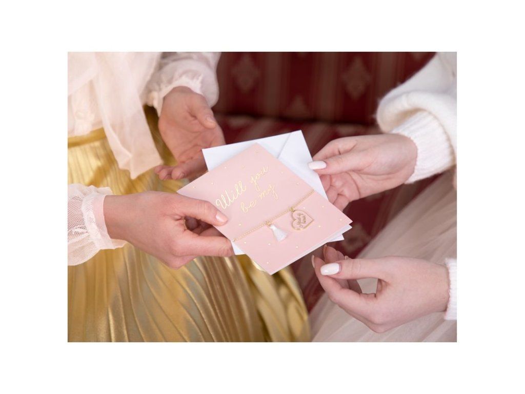 Картичката с гривна ще пасне идеално на дясната ръка на всяка булка. Зарадвайте първата си шаферка с розова картичка с надпис Will be my и гривна с надпис Maid of honor, сложете всичко в спретнатия бял плик, който е част от пакета.