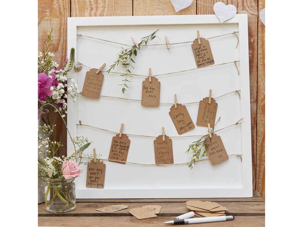 Дървена рамка с естествен канап, иглички и картички, на които всеки от sem гостите пише своите пожелания към младоженците. Тази оригинална сватбена книга за гости просто няма да ви омръзне и дори след години ще обичате да четете посланията и поздравленията от вашите приятели и роднини.