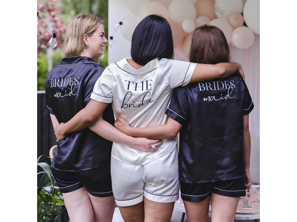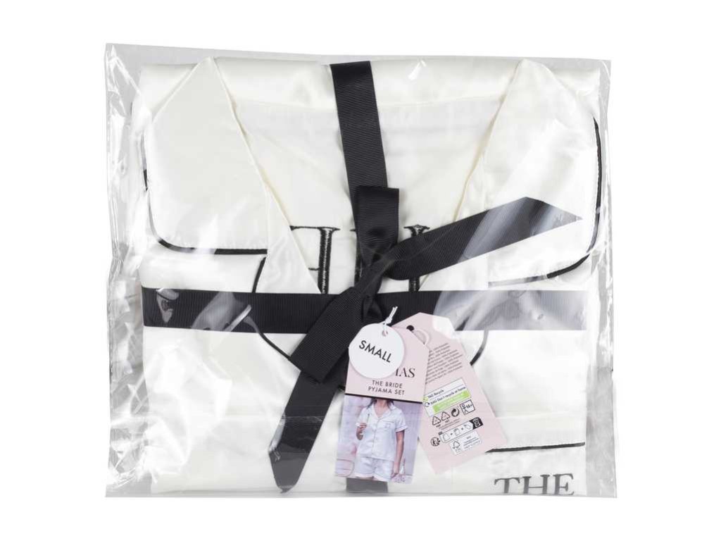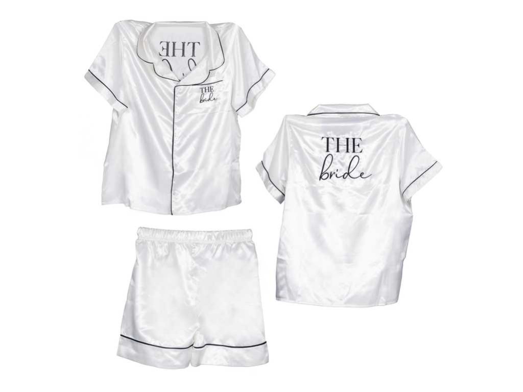 Приятна пижама от бял сатен с надпис The Bride за бъдещата булка, подарете на бъдещата булка тази луксозна пижама.