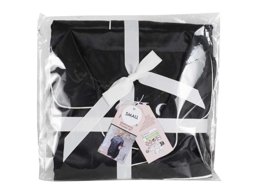 Луксозен черен пижамен комплект от две части с красива бяла обшивка, яка и закопчаване. На предната и задната част е бродиран надписът "Bridesmaid". Горнището е с къси ръкави, както и панталонът е с къса кройка. Пижамата е изработена от мека гладка черна материя, която е нежна на допир до кожата. Тази великолепна пижама е направена така, че да изглеждате и да се чувствате прекрасно на моминското парти на най-добрата си приятелка, но и след това, след като я облечете и с умиление си спомняте за тази прекрасна вечер.