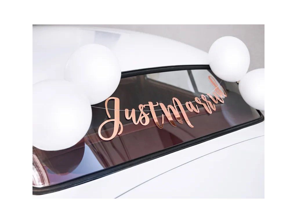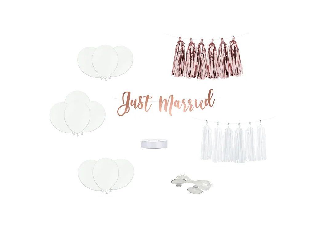 - Включва: 1 x транспарант Just Married в розово злато, 1 x гирлянд с пискюли в бяло, 1 x гирлянд с пискюли в розово злато, 10 x бели балони, 25 м сатенена панделка в бяло, 6 x вендузи, 12 м найлонова корда
