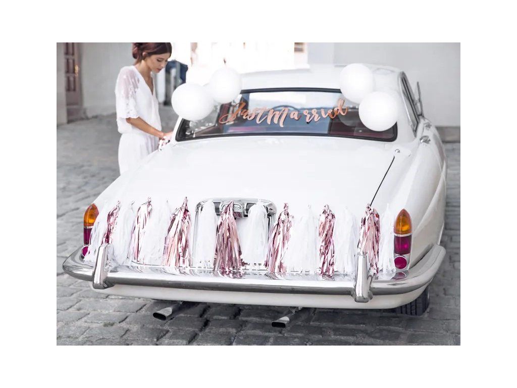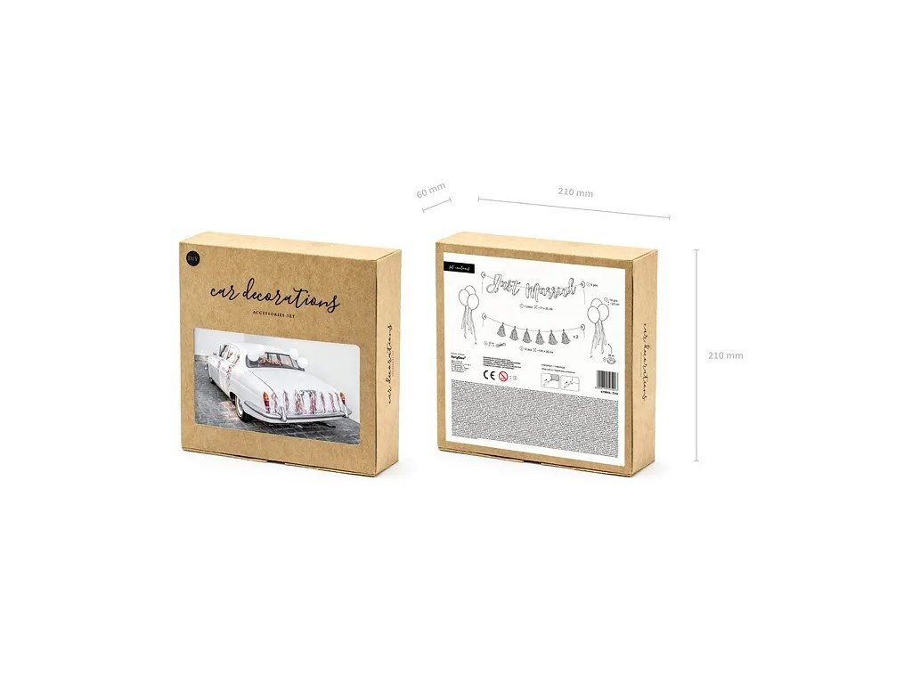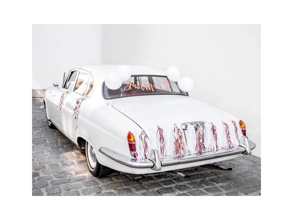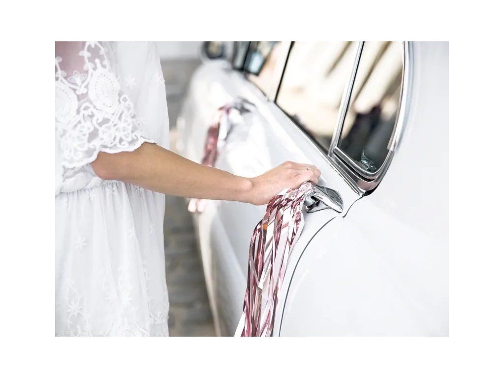 Сватбената декорация на колата ще донесе на вашата сватба романтика и нотка страст. Придайте на автомобила си специално докосване с надписа "Just Married", който може да бъде украсен с бели балони и висящ гирлянд в бяло и розово злато. Тази отличителна украса ще се откроява и ще придаде уникален чар, който ще бъде незабравим не само за вас, но и за всички ваши близки!