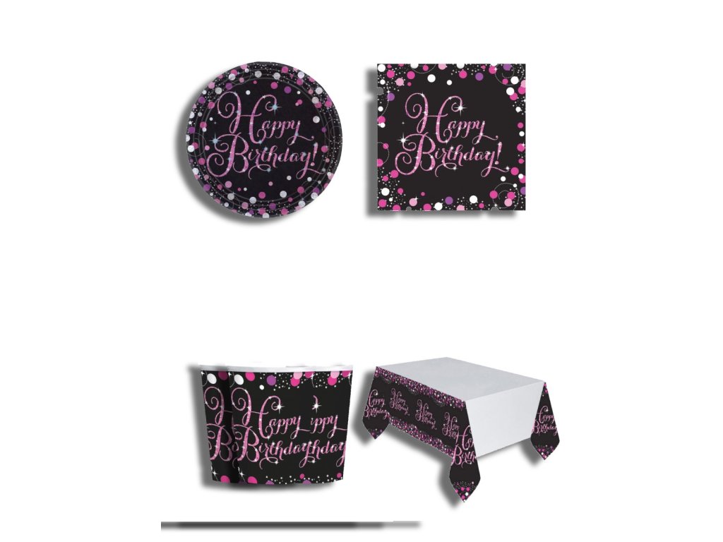 Комплектът парти продукти с розов мотив съдържа всичко необходимо за едно перфектно парти за рожден ден. В комплекта Happy Birthday ще намерите и други страхотни парти аксесоари, които ще ви помогнат да украсите партито за рожден ден.