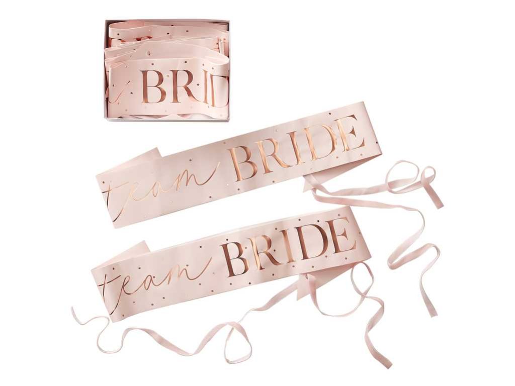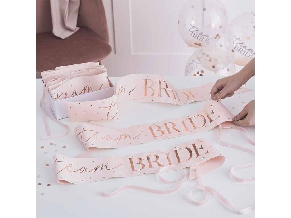 Уверете се, че вашите шаферки ще отпразнуват моминското ви парти заедно с вас с наистина изящни брандирани ленти. Подарете им тези красиви ленти в розова пудра с брандиране Team Bride с брокат от розово злато.