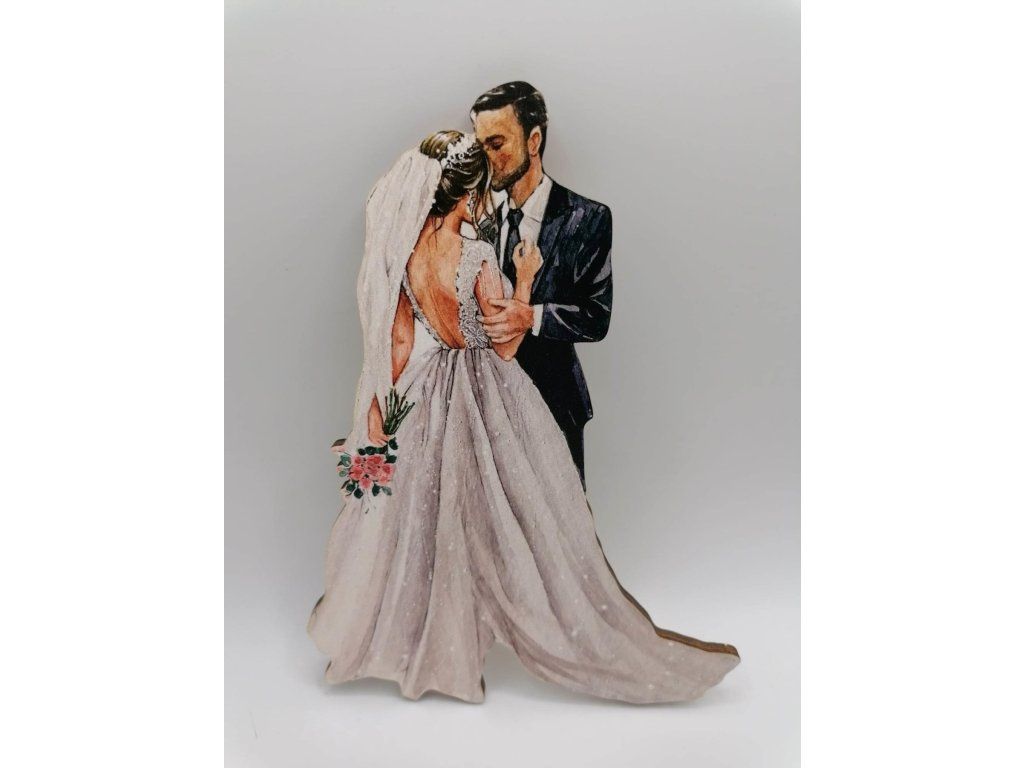 Уникален магнит с дървен дизайн под формата на сватбена двойка е идеален аксесоар за сватбена торта. Благодарение на тази елегантна декорация, дори от обикновена сватбена торта ще създадете уникална торта, на която всички ще се възхищават. Просто сложете дървено шишче на гърба на тортата. Магнитът не е предназначен за консумация, но запазването му ще го превърне в сувенир от вашия специален сватбен ден.