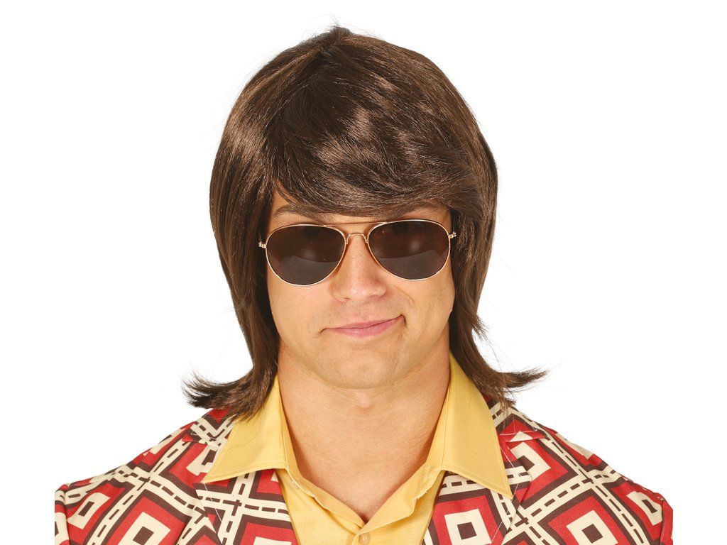 Мъжка перука от 70-те години с прическа в този стил. Кафява коса с дължина до раменете и характерен бретон, сресван настрани.