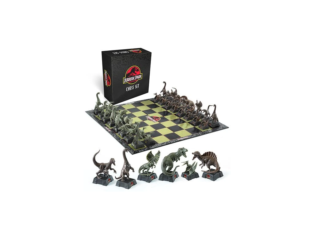 Шахът от поредицата Джурасик Парк ще ви отведе в света на праисторическите животни и в същото време ще практикувате тактическо мислене. Шахматният комплект съдържа 32 броя прецизно изобразени фигури на най-известните динозаври и картонена дъска. Кралят, разбира се, е Тиранозавър Рекс, Кралицата Спинозавър, стрелците са Дилофозаврите, ездачите са Велоцирапторите, Брахиозавърските кули и пехотните птеранодони.