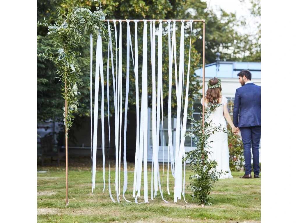 Окачете на портата за украса и създайте зашеметяващ фон за сватбени снимки – белите панделки превръщат портата за церемония в уникална декорация.