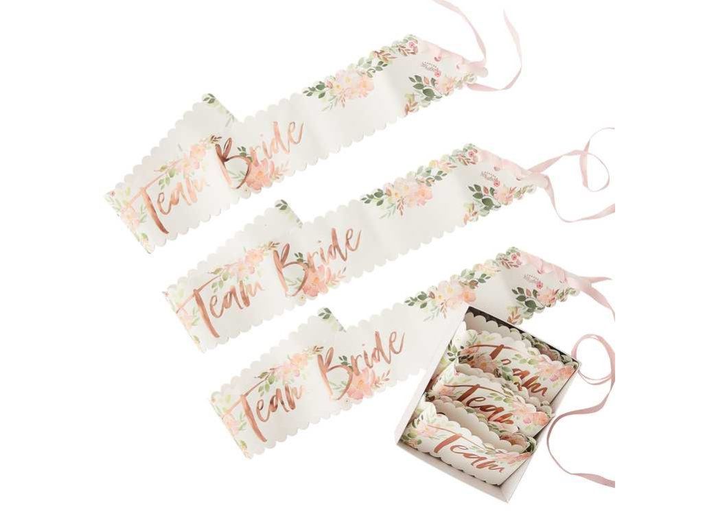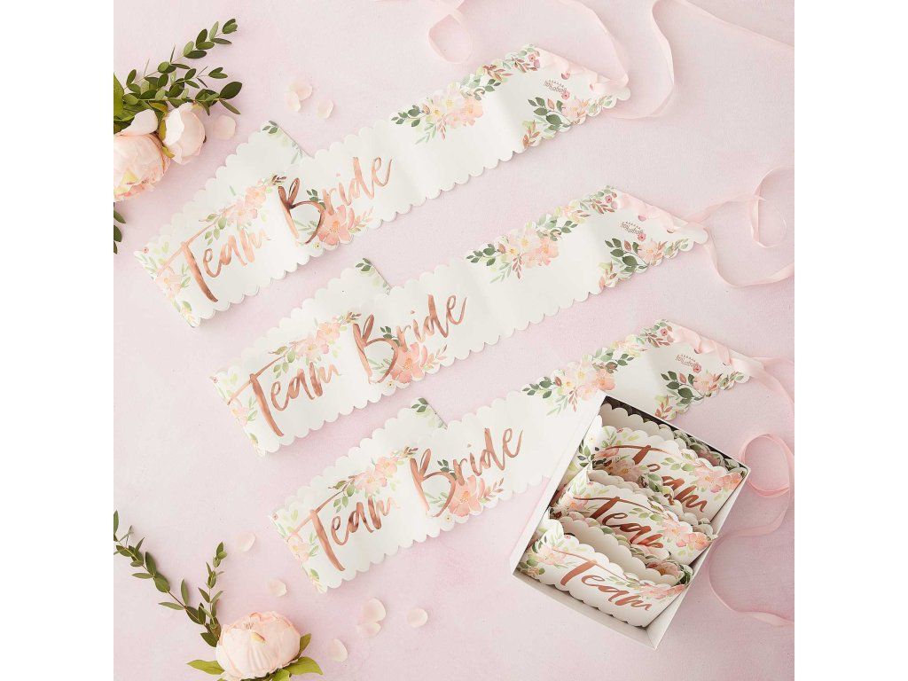 Уверете се, че вашите шаферки ще отпразнуват заедно с вас моминското ви парти наистина изискано. Подарете им тези красиви розови ленти с разкошни цветя с блестящи надписи Team Bride.